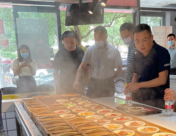 近日,省商務(wù)廳黨組副書記譚平率隊(duì)調(diào)研蒸瀏記,實(shí)地查看了蒸瀏記門店運(yùn)營(yíng)情況,現(xiàn)場(chǎng)了解蒸瀏記創(chuàng)新研發(fā)的全自動(dòng)瀏陽(yáng)蒸菜售賣機(jī)運(yùn)行模式,并圍繞企業(yè)未來(lái)發(fā)展、助企紓困舉措落實(shí)等方面進(jìn)行了座談。